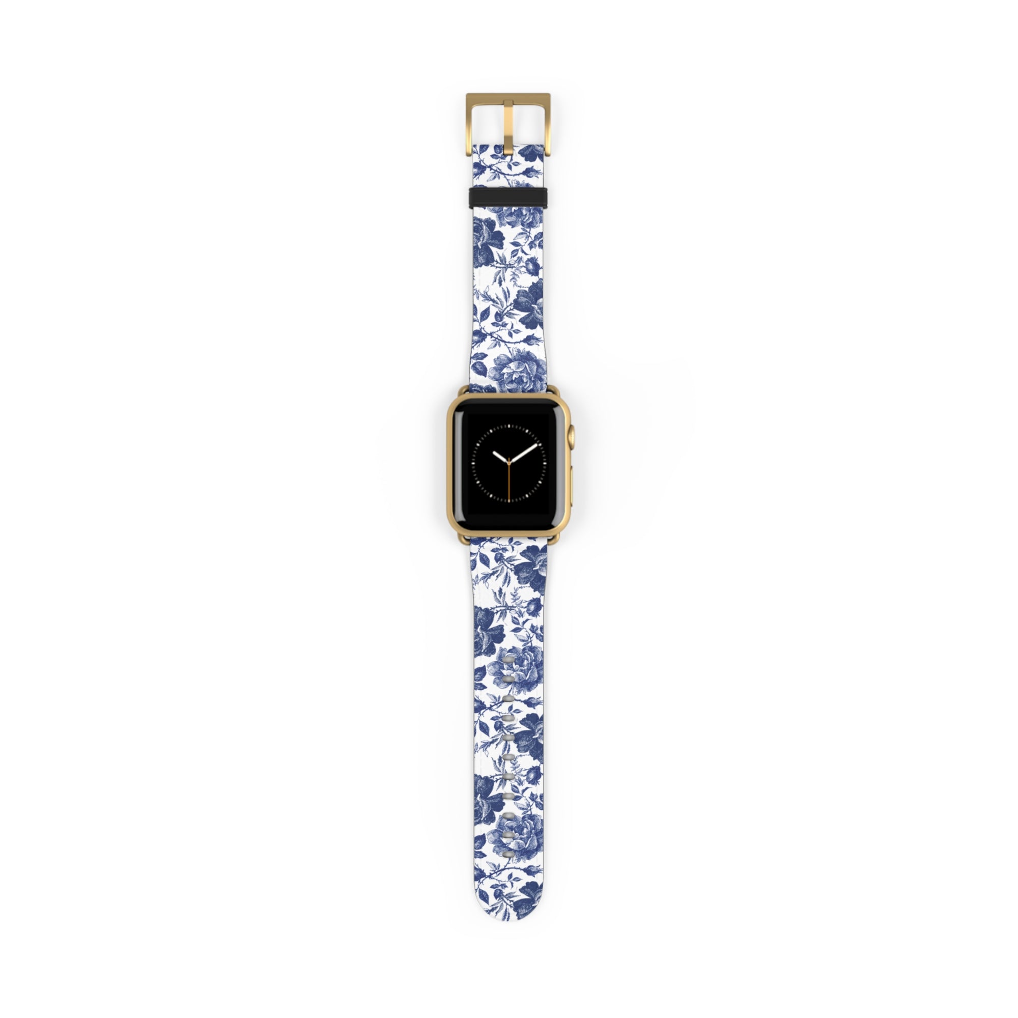 Give your Apple Watch a delightful upgrade with this cute faux leather band, featuring a vintage-inspired blue and white rose floral design.